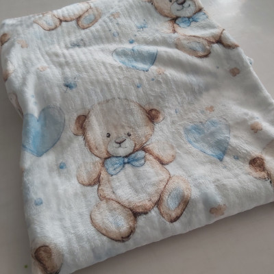 Coussin et doudou réalisés avec le motif Jolis Nounours avec Cœurs Bleus, imprimé sur le tissu Plush...